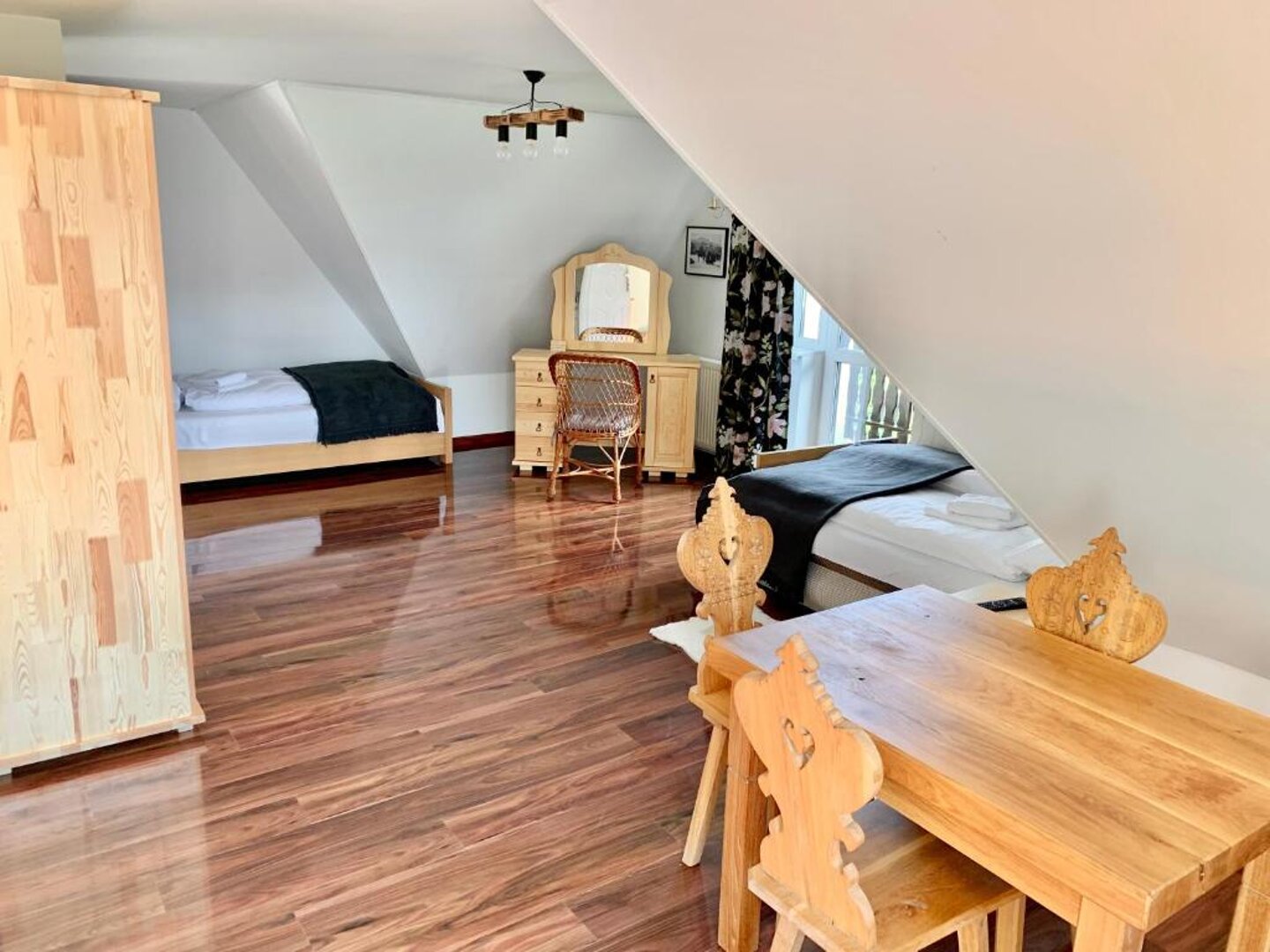 I piętro, pokój południowy, wspaniały widok na całe Tatry. Dla 2-3 osób. Łazienka, duży balkon, Internet, TV. Dwuosobowe łóżko oraz pojedyncze łóżko